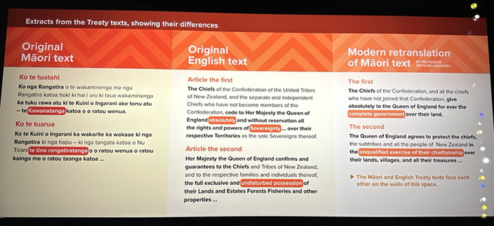 With surprising honesty, the exhibit explains that the British version of the Treaty and the Maori translation of the Treaty are not the same. The words used by the English in explaining the agreement to the Maori were interpreted differently when put into writing.