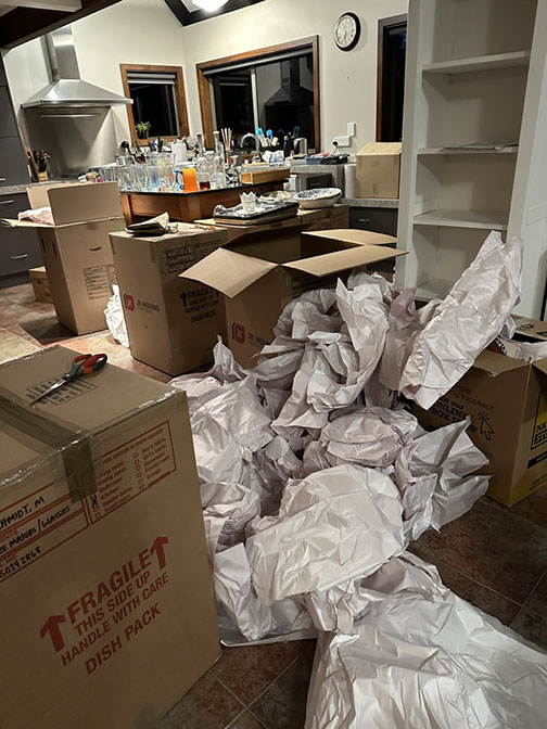 JoJo, on the other hand, has been completely freaked out by it all. He just cannot take the constant opening of boxes, tearing of tape and paper, and the noise, noise, noise! He is very curious, but the sensations and the exploration just seem to overwhelm him so that I often find him tucked into a corner or hiding under a piece of furniture. He seems lost as if he does not know what to do with himself. I keep reassuring him that we will get the boxes emptied soon.