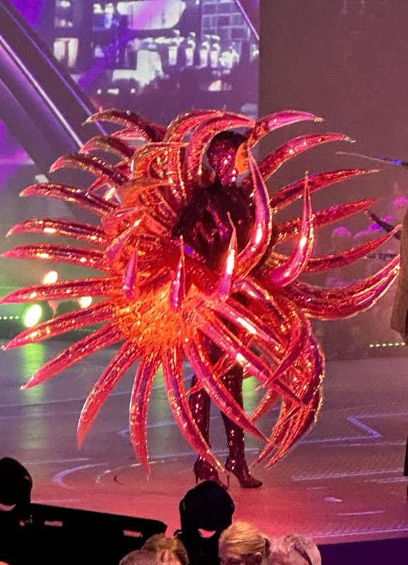 The costumes are modeled like a fashion show with mostly women, some men, parading down a catwalk and around a stage. We were not allowed to take photos during the show. We could only take photos of the preshow warm up. The Atlantic Magazine had an article about it here. There are photos there. Here is another.