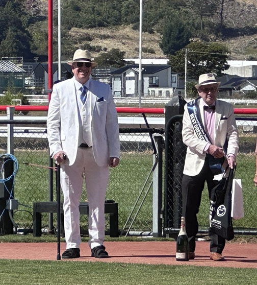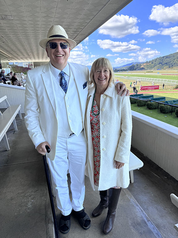 So when I randomly saw an advert for the New Zealand Oaks, I said, why not? The information said that proper horse racing day dress was required. So we went all in. A nice dress and jewelry for me. (No hat for me as the British ladies wear at Ascot. Not that I am against them. I love hats. I just don’t have any here.) Matt wore his white three piece suit with his straw hat. Matching blue shirt, tie and cuff links and of course his cane to make it all dapper.