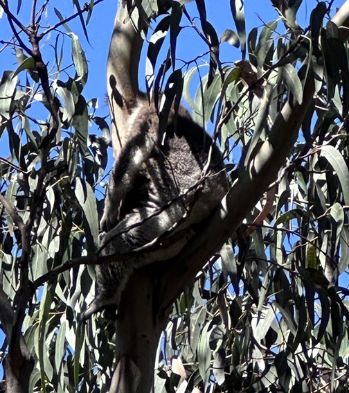 They are very, very tired most of the time. This has to do with their diet of eucalyptus. The leaves don’t provide much in the way of energy (no carbs) so they are just zonked most of the time. You can tell he just fell asleep in the middle of a meal. His back was to us, so the pic is not great. But damn it, we saw one that was not in a zoo or sanctuary.