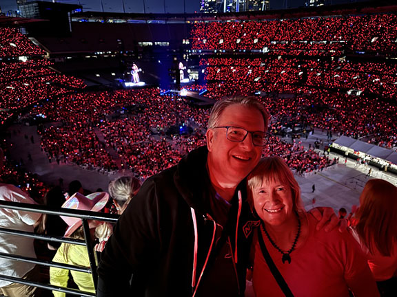 Six months later, February 2024, we boarded the plane bound for Melbourne. Approximately 99.9% of the people on board were going to the show. There were Swifties everywhere—preteens, teens, young adults, and mature women like myself. They wore decorated cowboy hats and friendship bracelets and Taylor tees. Many were dressed in pink. The captain announced that we were on Air New Zealand Flight 1989 and the passengers erupted in cheers. He said he did not know why everyone was so excited about the Flight number but her would ask his daughter who was a Swift fan. (It’s a clever reference to a Swift album.)