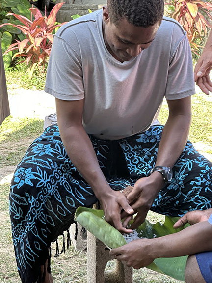 Here they are showing us how to get the coconut meat out of the coconut using a sharpened bamboo pole. The coconut bowl is scrapped in a circular motion. I tried this at the resort and it was harder than it looked.