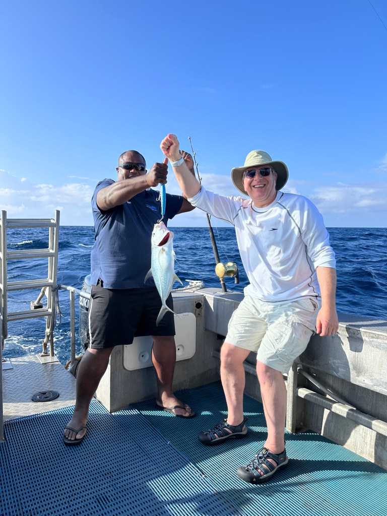 We left the trevally with the boat captain and took the tuna to the chef who agreed to prepare it for us. That is as fresh as fish can get. We got two dinners out of it, appetizers and dinner—sashimi and grilled tuna one night and ceviche and curry the next night. It was delicious. (There was no option to freeze the fish and ship it home. They had never heard of such a thing.)