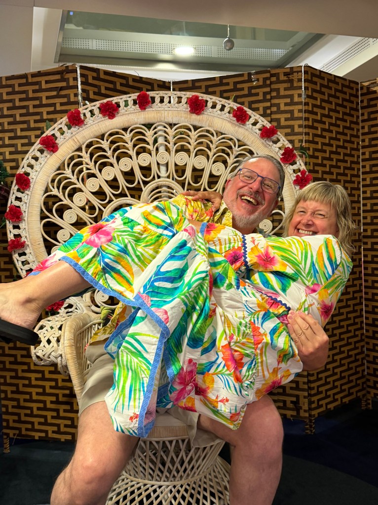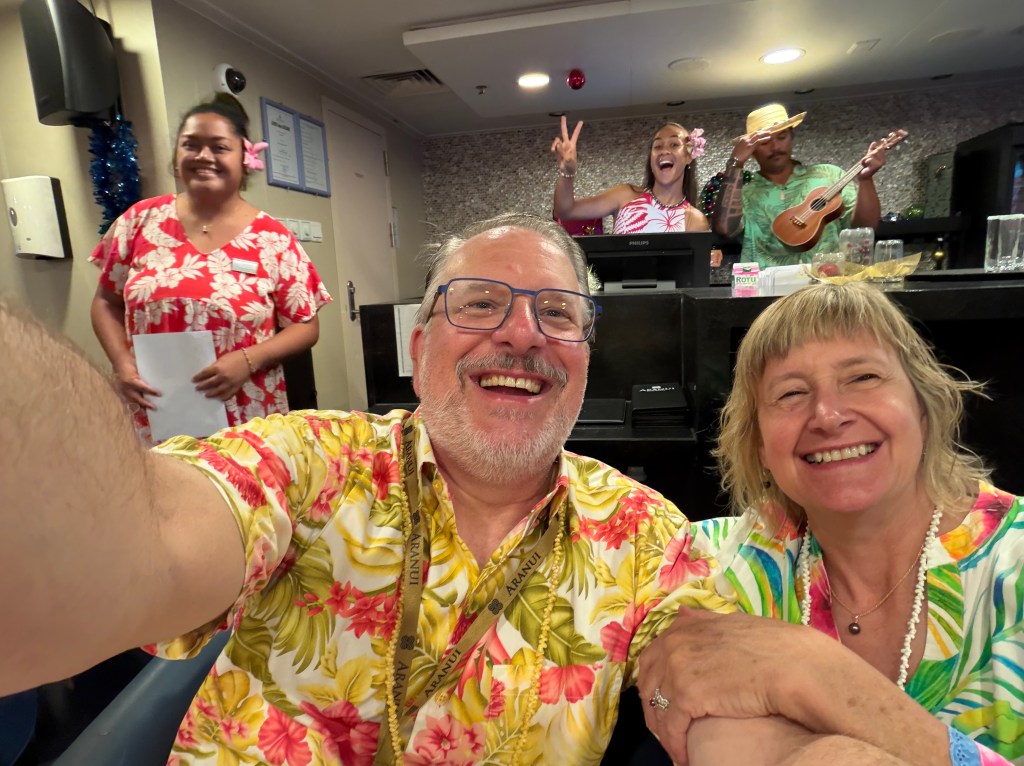 Despite my misgivings, we showed up to the room at the specified time as did ten other couples. Sure enough, the young folks in charge of entertainment explained that they were so in awe of the longevity of the marriages of those in the room, they wanted to celebrate it. They sang us Polynesian love songs and asked each couple to explain how long they had been married and what it was like. The length of time varied from 30 years (us) to over 50 years. That couple won the prize, which was cutting the “wedding cake.” The vow renewal came in the form of exchanging shell necklaces that they had provided to us. And that was really it. Just putting on a shell necklace. No recitals or vows. So that wasn’t so bad, I guess. Then we sat for photos. Make of it what you will.