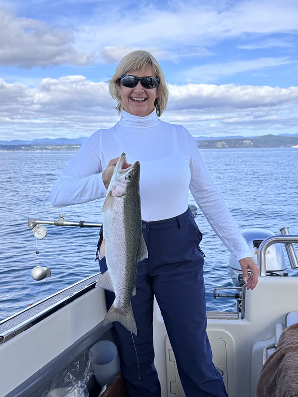 Next stop Lake Taupo.  At the end of the summer we drove to Taupo, about four hours north, and home to excellent trout fishing.  In fact, this is the trout fishing capital of New Zealand.  You have two options—go fly fishing on a river or go trolling on the lake.  Seeing as fly fishing requires work and trolling requires sitting on a boat enjoying the day waiting for a to fish bite we chose sitting on our butts.